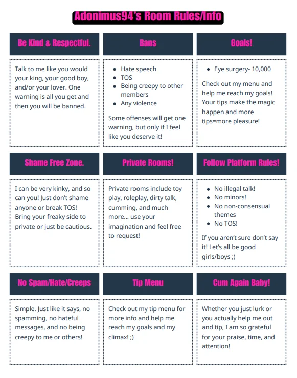 Dirty Talk, Exhibitionisme, Rouler des mécaniques, Fétichisme des pieds, Masturbation guidée, Masturbation, Strip-tease, Sextoys anaux, Évaluation de bites, Anneau de bite, Cosplay, Giclées de sperme, Gode ou vibromasseur, Éjaculation, Dance érotique, Show huileux, Jeux de rôles, Sextoys, Sous la douche, Fessée, Ahegao, Gagging